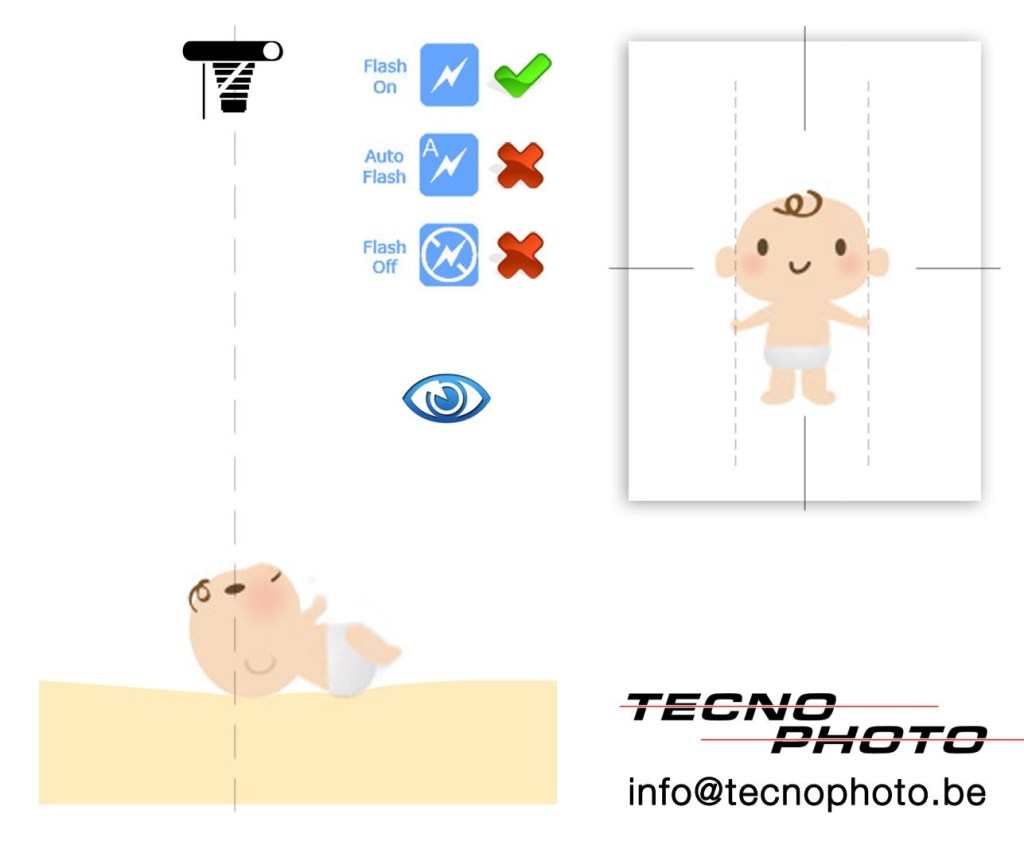 – Positionnez-vous au-dessus de votre enfant (les jambes de part et d’autre de lui au niveau de ses hanches). Ne cherchez pas à approcher l’appareil photo ni à cadrer (nous pouvons voir votre bébé jusqu’à la taille)